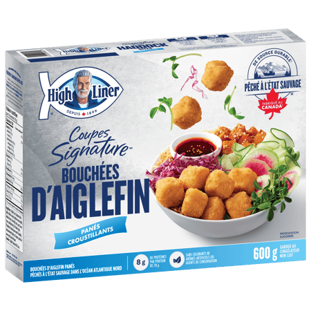 Aiglefin, Eau, Chapelure de blé grillée, Huile de canola, Amidon de maïs modifié, Amidon de maïs, Farine (blé, maïs, soya), Sucres (sucre, maltodextrine), Sel, Poudre à pâte, Phosphate de sodium (pour retenir l'humidité), Assaisonnements (épices, ail, oignon, poudre de sauce soya), Gomme de guar.