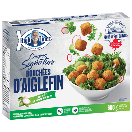 Aiglefin, Eau, Chapelure de blé grillée, Huile végétale (canola, tournesol), Amidon de maïs modifié, Farine (blé, maïs), Sucre, Assaisonnements (ail rôti, oignons, fines herbes), Sel, Poudre à pâte, Phosphate de sodium (pour retenir l'humidité), Essence naturelle (basilic, poivre noir, origan), Phosphate d’aluminium et de sodium (acide de levage).