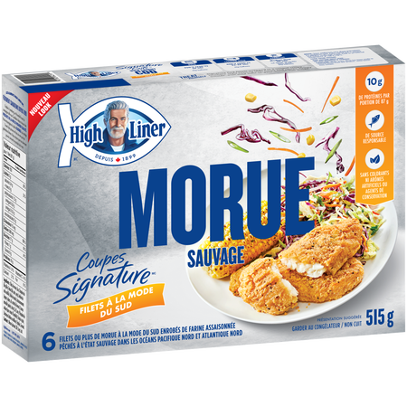 Filets de morue High Liner® de première qualité, apprêtés dans un enrobage original de farine aux herbes et aux épices à la mode du Sud. Ils sont croustillants à l'extérieur, moelleux et floconneux à l'intérieur. Morue pêchée à l'état sauvage dans l'océan Pacifique Nord.