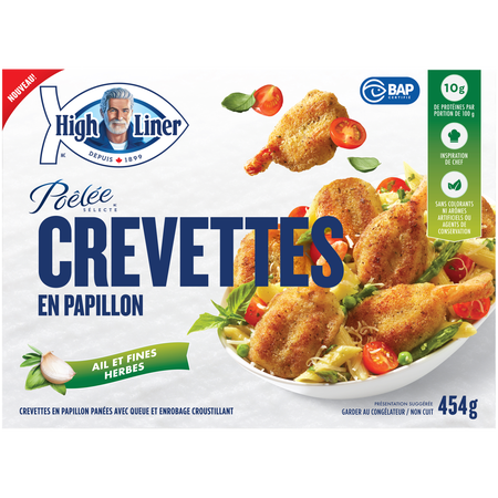 Enfin la qualité et le goût de crevettes papillon dignes d’un restaurant dans le confort de votre maison. Chaque morceau est enrobé d’un mélange exquis d’ail et de fines herbes. Allez-y, impressionnez vos convives avec les saveurs décadentes et les alléchantes et croustillantes crevettes en papillon ail et fines herbes Poêlée SÉLECTEᴹᴰ de High Liner.