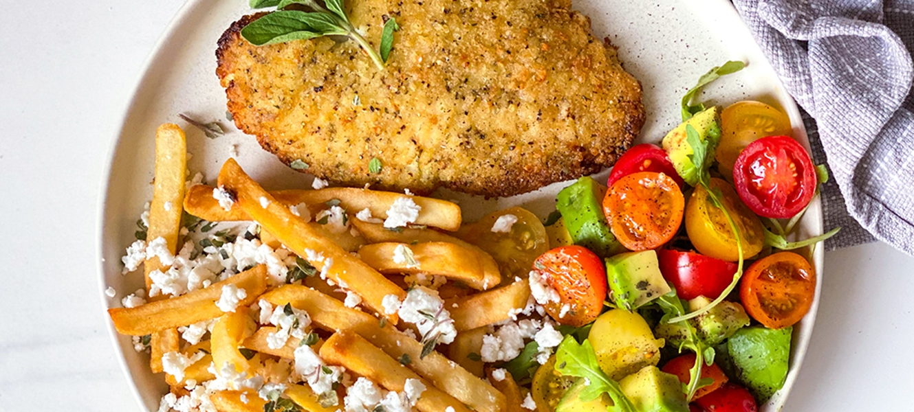 Ce plat a tout pour lui. Des filets de poisson assaisonnés au poivre et au citron, une salade crémeuse à l’avocat et de croustillantes frites grecques. De quoi satisfaire tous les goûts!