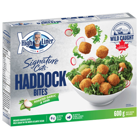 Haddock, Water, Toasted wheat crumbs, Canola oil, Modified corn starch, Flour (wheat, corn), Sugar, Seasonings (roasted garlic, onion, herbs), Salt, Baking powder, Sodium phosphate (to retain moisture), Natural flavour (basil, black pepper, oregano), Sodium aluminum phosphate (leavening acid).