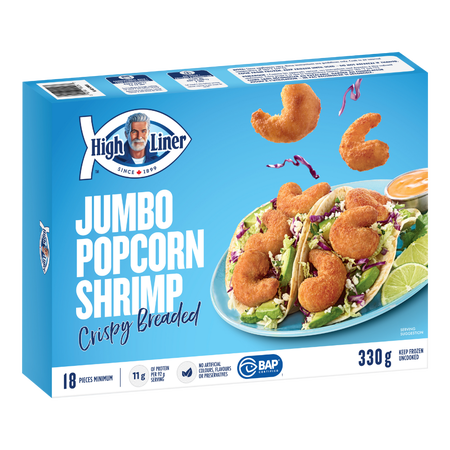 Plump shrimp in a crispy breaded coating. Bursting with savoury flavour, High Liner® Jumbo Popcorn Shrimp makes a great snack or can be used as part of a meal the whole family will love. Try it for your next taco night!