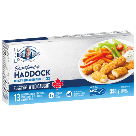 Introducing the nutrition of fish with our High Liner® Haddock Fish Sticks. Made from tender, moist Haddock fillets and coated in a crunchy breading, these fish sticks are tasty and fun to eat.