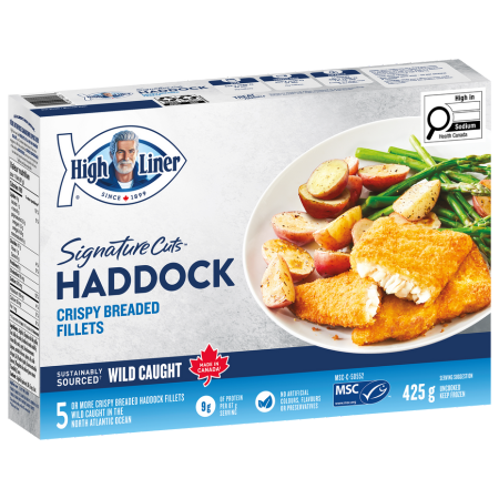 High Liner® premium haddock fillets are wrapped in a crunchy golden breadcrumb. It's crispy on the outside, with moist flaky fish on the inside. Wild caught in the North Atlantic Ocean.
